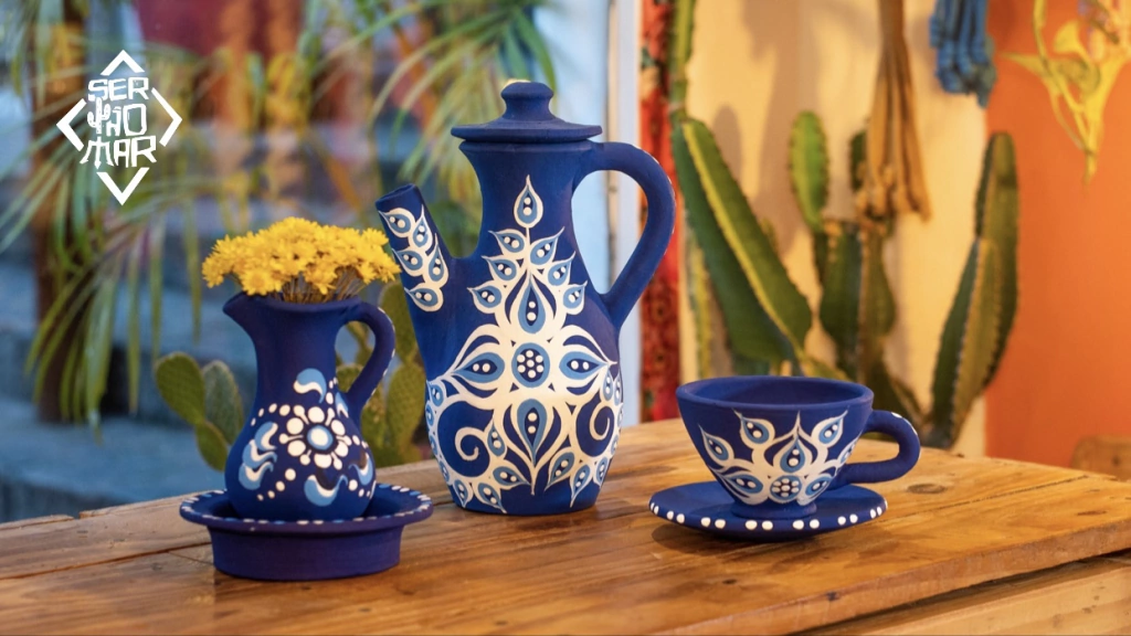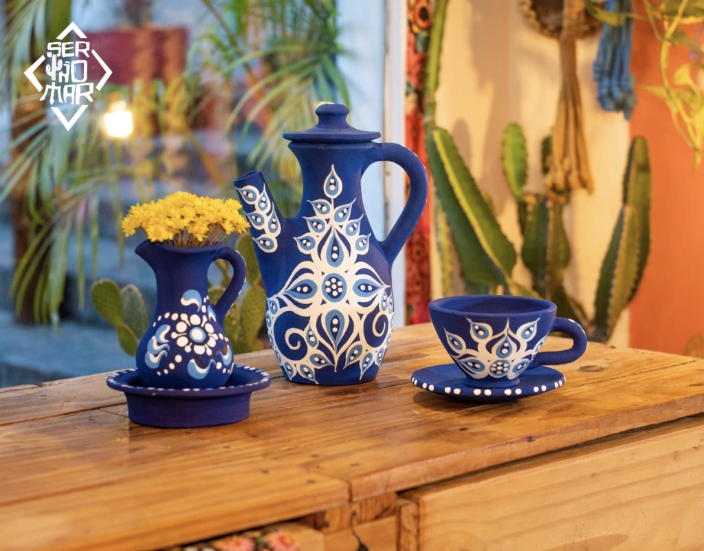 Bule de cerâmica pintado à mão, na tradicional pintura potiguar por artesão local.