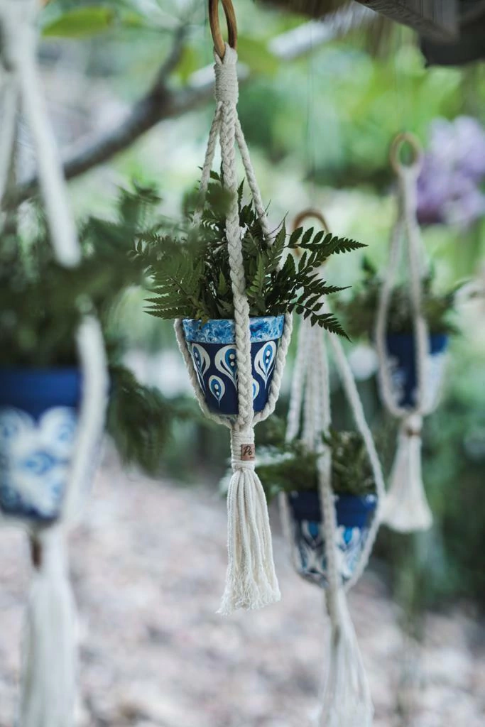Transforme seu espaço com este conjunto único de suporte de planta de macramê, feito manualmente por um talentoso artesão da Praia da Pipa. Este suporte, com aproximadamente 55cm, é o complemento perfeito para o seu jarrinho de cerâmica potiguar, que possui 13cm de altura e 10cm de diâmetro e é pintado à mão, refletindo a rica cultura local.