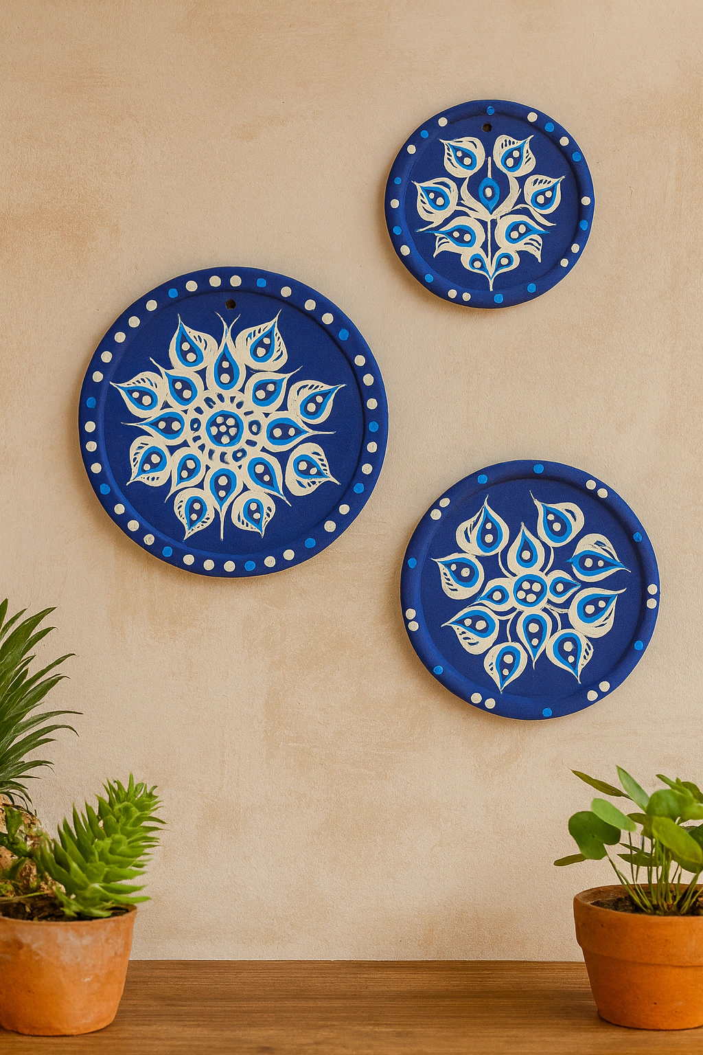 Mandalas de cerâmica, pintadas à mão por artesão local na tradicional pintura potiguar.